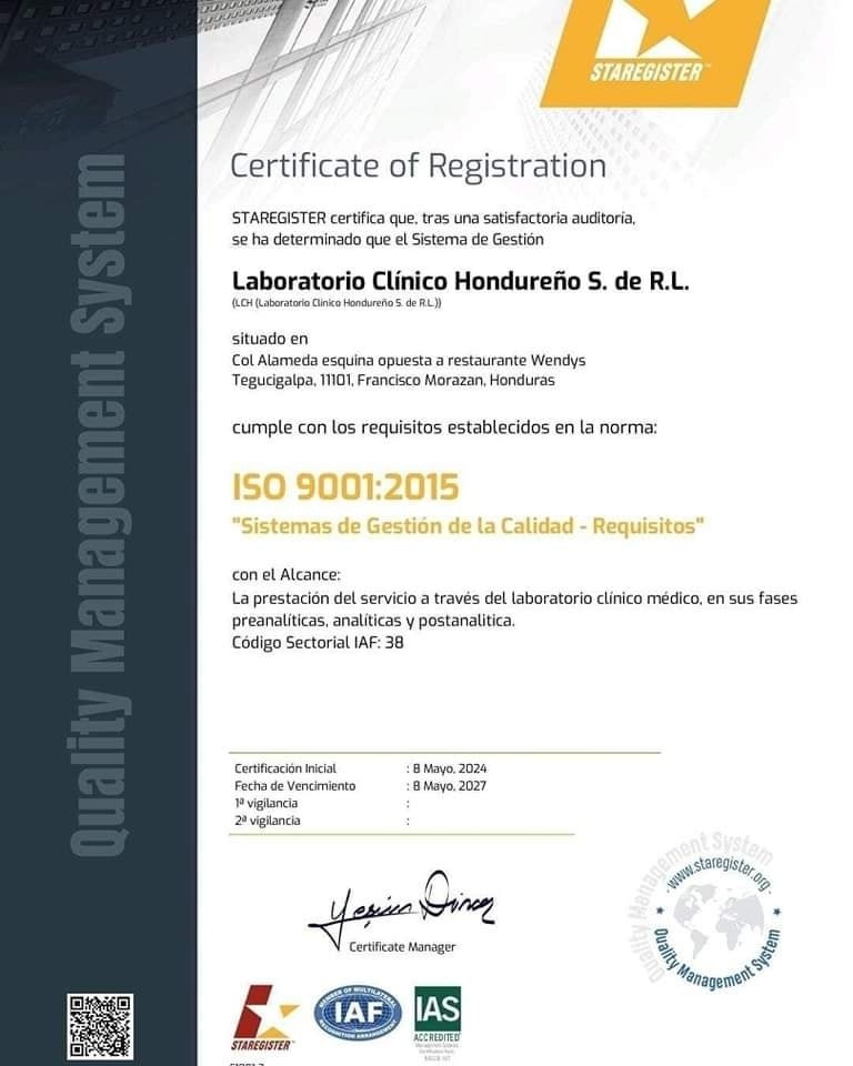 Somos un laboratorio certificado bajo la norma ISO 9001-2005 lo que garantiza que tus resultados sean seguros, precisos y confiables.
